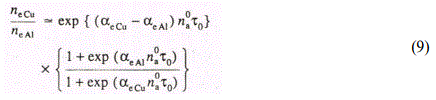 where na, ni, ne are the densities of atoms, ions and electrons, respectively. Considering the fact that the quantity αe ne is the probability of two-particle collisions per unit time we see that increased ionization efficiency in the aluminum matrix compared to the copper one is either due to larger value of ne, or due to higher Tt. In doing so the values ne and Tt are coupled to each other, but increase of Tt results in increase of probability of electron collision with an atom, while increase of αe results in increase of ne for the corresponding impurity element because according to Eq. [16]