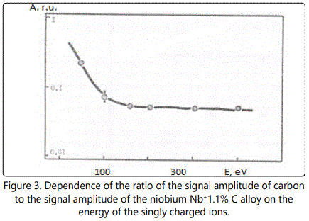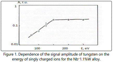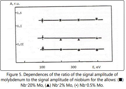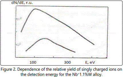 In time-of-flight systems, as a rule, power transmission of the device is substantially less than the width of the energy spectrum of the ions of the laser plasma torch. Since the energy spectra of the ions of different elements in the region of high energies are, in general, different, the detection of the ions in a narrow energy range leads to errors during the elemental analysis of materials. Figures 1–6 show the amplitudes dependences of the signals and the relative yield of niobium-based alloys. For ‘pure’ niobium the maximum energy distribution of singly charged ions corresponds to the energy of 100eV, whereas for tungsten alloys the maximum energy distribution of tungsten shifts to higher energies and is equal to 150eV. In this case, the power transmission of the mass spectrometer was about 2eV. Figure 5 and Figure 6 show the relative yield of singly charged ions as a function of the detection energy for the two alloys. These graphs clearly explain the errors arising in determining the concentration of elements, if the power transmission of the mass spectrometer is much less than the energy spectrum of the ions. For alloys we failed to observe the differences in the energy distributions of singly charged ions. Figures 5 and 6 show the dependences of the relative yield of singly charged ions on the detection energy for three concentrations of molybdenum (20%, 2% and 0.5%) and zirconium (1%, 0.5% and 0.1%).