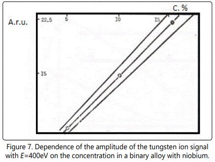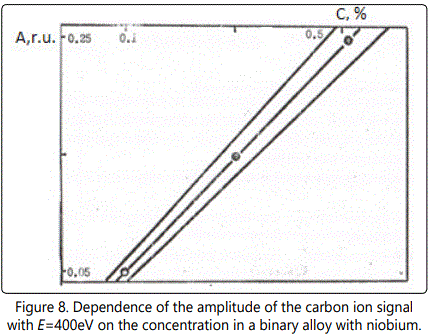 Calibration curves (Figures 7–8) at 6×109W/cm2 and the diameter of the focal spot of~100µm for different concentrations of tungsten and carbon are presented for the ion energy of 400eV. The concentration of carbon and tungsten is determined with an accuracy of better than 10%. Table 1 shows the results of analysis of industrial alloys using EMAL-1 and compares them with the results of chemical analysis.