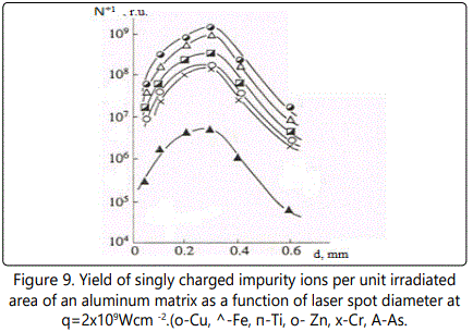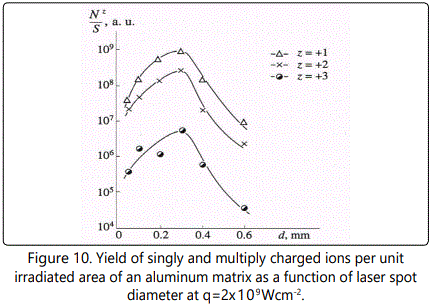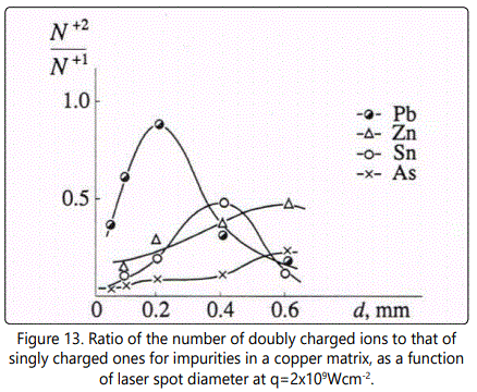 The yield of singly charged impurity ions as a function of the laser spot diameter at q=2x109Wcm-2 is shown in Figure 9 The dependence N+z/ S is similar for all impurity ions: this function rapidly grows as d increases from 0.05 to 0.3mm; in doing so at d>0.2mm the function slope with respect to the abscissa becomes more gradual; at d=0.3mm the function attains its maximum and starts to decrease steadily with further increase in d.