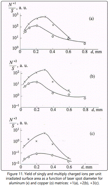 If the laser spot diameter is small, so that processes of ionization dominate in the plasma plume, the absolute yield of impurity ions is determined by the ionization rate constant of the matrix atoms (this constant governs the number of electrons in the plume). In this case the relative yield of impurity ions is determined by the conditions of excitation, and characteristics of the corresponding impurity atoms (their first ionization potentials) and atoms of the matrix (their mass and ionization rate constant), and can be calculated a priori.
