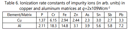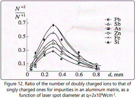 Let us compare ionization of impurity atoms in copper and aluminum matrices. The ratio of the number of ions formed at the maximum of the function N+z/ S to that formed at d =0.05mm and q=2x109 Wcnr2 in these two matrices is given in Table 6. It is seen that efficiency of ionization characterized by the growth rate of the function N+z/ S is higher for impurities in the aluminum matrix compared to that in the copper one. This fact is also clearly seen in Figure 11. The observed dependence can be explained as follows. Taking into account the fact that during plume expansion, ions of the matrix and impurity behave similarly, one can suppose that the difference in ionization efficiency is due to characteristics of the plasma plume determined by the matrix (the target excitation conditions are assumed to be the same). The lifetime τ0 governed by the matrix component [26] has little influence on efficiency of ionization processes because we neglect the recombination process in the plume at d<dopt. On the other hand, ionization of impurity elements is governed by Ref. [35]