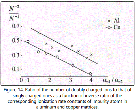 It should be noted that differences in dependencies for copper and aluminum matrices are not connected with the peculiarities of ionization processes. This conclusion is illustrated by Figure 14 which shows the ratio of the number of doubly charged ions to that of singly charged ones as a function of inverse ratio of the corresponding ionization rate constants αe1/αe2 of impurity atoms in copper and aluminum at q=8x108Wcm-2. The value decreases with increase of the ratio αe1/αe2 with the same rate in copper and aluminum. Larger absolute values