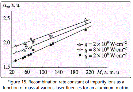 It was pointed out above that the right branch of the function is governed by dominating processes of recombination. Let us determine the recombination rate constant αp similar to αe, namely from the rate of decrease of brightness as d increases. The experimental data on recombination rate constants of singly charged ions as functions of their mass at various values of q are shown in Figure 15 It is seen that αp increases with increase of M from 1.8 for P to 2.3 for Pb at q=8x108Wcm-2. In doing so the character of the dependence of αp on M does not change and remains linear: αp~M. As q increases from 2x108 to 2x109Wcm-2, αp increases for all impurities though this increase is not significant and amounts to less than 30%. This circumstance can be attributed to the fact that increase of q results in increase of the number of “cold” electrons and consequently in increased efficiency of recombination processes in the plasma plume. Additionally this simultaneously raises the yield of doubly charged ions. As these ions recombine, they contribute to the singly charged plasma component. Consequently, the variation of αp with increase of q is not so considerable as one might expect from consideration of the influence of Ne only at the stage of ion recombination. It was shown in [20] that in the process of copper plasma expansion αp does not depend on M for fixed z. Strong correlation between the recombination rate constant and ion mass of the corresponding impurity in aluminum is due to variation of the plasma plume parameters. Increase of ne results in more effective recombination as is seen in Figure 11 in the case of singly charged ions of iron in copper and aluminum. Variation of τ τ0 in accordance with Eq. (1) results in increase of αp for impurity ions with a mass larger than that of the matrix component. This is due to faster expansion of aluminum plasma compared to the copper plasma.