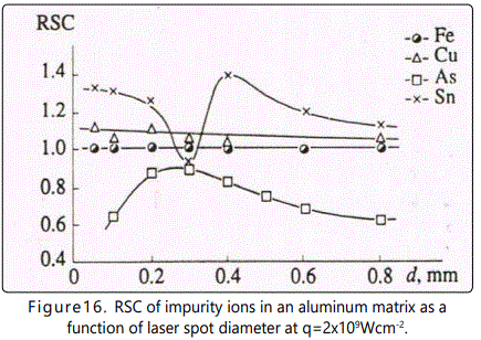 Consider variation of the relative yield of ions at different masses of the matrix component of the plasma plume. Figure 16 shows RSC of impurities in a sample with aluminum matrix as a function of d at q=8 x108Wcm-2. Note that only singly charged ions were taken into account when calculating RSC because their yield amounted to more than 90% of the total number of ions. At d<0.3mm ionization processes dominate. As the laser spot diameter d increases from 0.05 to 0.3mm the value of RSC for Sn drops from 1.30 to 0.91, and the value of RSC for As grows from 0.65 to 0.88. Such behavior of RSC as a function of d for these elements is due to the fact that the first ionization potential of Sn is lower, and that of As is higher, than the first ionization potential of the internal reference element (iron, in the case under consideration). In addition, it is seen that the most striking decrease of RSC for Sn takes place at d ranging from 0.2 to 0.3mm. Variation of RSC with increase of d in this interval is governed by the fact that increase of the plume lifetime results in more effective interaction of electrons with evaporated atoms, which is described by the relation obtained in [24-26]