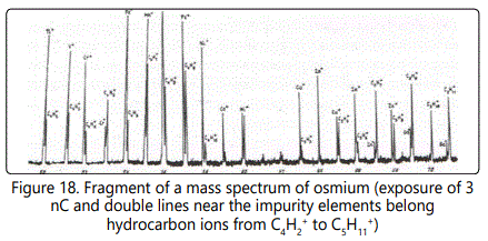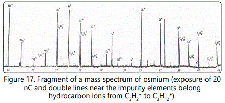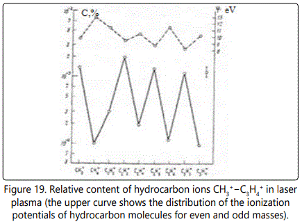 The most intense lines are formed by the ions CH3+, C2H3+, C3H3+, C3H5+, and C3H7+ containing an odd number of hydrogen atoms. The intensity of each of these lines in terms of the concentration may in some cases be as high as 0.8−2×10-3 at.%. Figure 17 shows a fragment of the mass spectrum of an osmium sample with an exposure of the 3 nC. One can see lines of hydrocarbon ions from C2H2+ to C3H+ with their content from 10-4 to 2×10-3 at. %. At an exposure of 20 nC. The mass spectrum of a multicomponent biological object (Figure 18) exhibits lines of hydrocarbon ions from C4H2+ to C5H12+ with their content from 10-6 to 10-4 at. %. In a series of hydrocarbon ions with the number of hydrogen atoms n = 2 to 12, one can observe more intense lines of ions with odd masses in comparison with even masses from 1.5 to 25 times. This phenomenon can be explained by the difference of the ionization potentials of the corresponding molecules and radicals: for odd masses they are lower than the even ones (Figure 19).