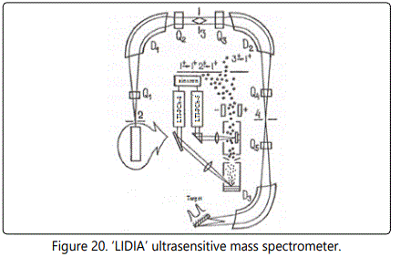 The search for small amounts of super-heavy atoms in nature requires the use of a highly sensitive and rapid analysis. This can be done by the mass spectroscopy with direct detection of ions. To this end, an ultrasensitive mass spectrometer ‘LIDIA’ was developed, the scheme of which is shown in Figure 20 This mass spectrometer includes a laser-plasma ion source, a vapor or laser target, an electrical system of selection of the ion component, and a multi-split system to reduce the background of rescattered ions. The relative sensitivity of the mass spectrometer is 10-7−10-9 at. %, the sample weight is 100 mg, and the analysis time is 2-3 hours.