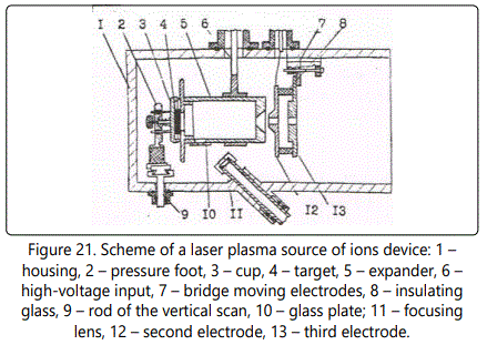 Laser ion sources for mass spectrometric analysis of solids can be divided into two main types according to the purpose for which the laser is used: either as an evaporator for sampling, or for producing a dense high-temperature laser plasma, which is an emitter of ions. The first type of the laser source and analytical capabilities of combining a laser (free-running regime) and a mass spectrometer were studied by many authors. Although the characteristic dimensions of the structural elements of laser sources in these cases vary somewhat, the principle of their action is the same, and the main parameters are close. For the second type of ion sources a dense high-temperature plasma, which is an emitter of ions, is produced during laser irradiation.