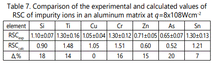 Thus, the function N+z/ S behaves similarly for all impurity ions both in copper [24] and aluminum matrices. In doing so in the case of impurities in the aluminum matrix the function N+z/ S attains its maximum at larger spot diameters, and the rate of increase of the number of ions with increase in d is larger. The question arises of why the maximum of the function N+z/ S shifts for the same ions? It was shown earlier that me maximum of this function is governed by the competing processes of ionization and recombination and can be determined from a simple relation
