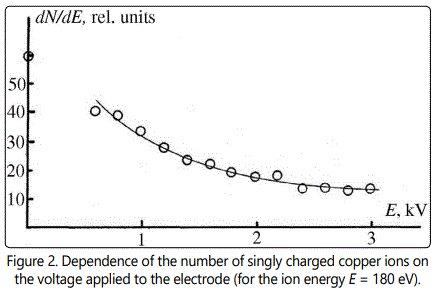The experimental setup is shown schematically in Figure 1a. The main elements are an LTI PCh-8 laser, a chamber of interaction of radiation with matter and a time of-flight mass spectrometer with a magnetic analyzer. Laser light in the interaction camber was focused on a target made of copper, molybdenum, and carbon. Electrodes, to which a voltage from the power supply was applied (Figure 1b), were located at different distances from the plasma torch formation and at different angles to the plane of the sample. The targets were in the center of the chamber and rotated so that the point of the plasma formation did not change its position with respect to measuring devices and the electrodes. Figure 2 shows the dependence of the number of singly charges copper ions on the voltage applied to the electrode [electrode (7) in Figure 1a] at an ion energy of 180 eV. Upon reaching the voltage of 600V the number of ions in the beam is significantly reduced, and at a voltage of 2.5 kV the number of ions emitted in the direction of the analyzer is five times less than initially. When considering the impact of the field of the electrode with the 3-kV voltage applied (Figure 3), it is found that the overall structure of the energy distribution remains the same, but the number of particles in the left low-energy part of the spectrum decreases.