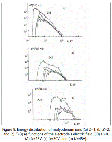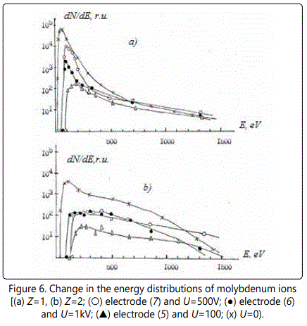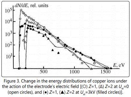 First, it is convenient to consider the effect of the potential on the plasma expansion products at the ring electrode, registered in a distance of 362cm (Figure 9). For singly charged ions at a voltage of 15 the energy distribution narrows down both on the left and the right (wings) with a simultaneous decrease in the number of particles in the distribution maximum. A subsequent increase in the potential affects only the reduction in the intensity maximum without changing the ‘wings’ of the distribution.