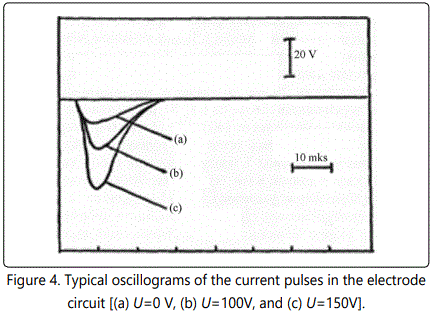 It was shown above that when a positive potential is applied to the electrode, which can be located in different parts of the vacuum chamber, we can observe the effect of some potential on the characteristics of products of laser plasma expansion. It was found that the effect is observed only when the electrode is immersed in the plasma (the electrode can be located behind the bulk sample). Only when the electrodes are completely isolated from the plasma, no effects are observed. Let us analyze the oscillograms of the currents that flow in the circuit of the electrode. The electric circuit of connection of the electrode to the power source is shown in Figure 1d. The current amplitude increases with increasing voltage on the electrode. The pulses appear with a delay with respect to the time of exposure to laser radiation and plasma torch formation. The value of the time delay is 7 µs for the case when the electrode is at a distance of 10cm for the copper sample. The current maximum corresponds to 27±3µs and drops to the level of 0.1 during 150±10 µs. The delay time decreases and is 5µs for the electrode located at a smaller distance (5 cm) from the sample (molybdenum). The time of the current maximum corresponds to 11±3 µs and falls during 33±5 µs.