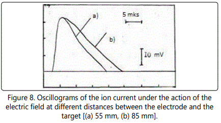 As follows from the spectra in Figure 6, the greatest effect on the plasma was exerted by the electrode that is closer to the point of the plasma torch formation. In this case, the greatest effect was achieved at the electrode (5) for a voltage that is 10 times smaller than at the electrode (7). Besides, the shape of the electrodes also changed. The influence of the electrode position on the plasma expansion products was studied using a steel electrode in the form of a ring (2) with an outer diameter of 30mm and an internal diameter of 26mm, and thickness of 6mm (Figure 7). The electrode was moved along the 1-1 axis, and the distance between the electrode and the sample varied from 140 to 55mm. In the vicinity of the point of the plasma formation, it was impossible to mount a ring electrode, and so use was made of the electrode (3), which represents a segment of an 8-mm-long RK-50 cable with a diameter of 0.5mm. The electrode was placed at a distance of 8mm from the point of the plasma formation torch along the 1-1 axis and 10mm lower. Figure 8 shows the oscillograms of the ion signal obtained from a collector installed at a distance of 14cm from the sample on the 1-1 axis. The first grid before the collector is grounded, and a voltage of 100V is applied to the second grid. The oscillograms of the ion signals were recorded for two positions of the ring electrode [(a) 55 mm, and (b) 85mm]. The radiation flux density in these experiments was 109W/cm2, and the sample was made of molybdenum. The potential on the ring electrode was +50V. The comparison of the oscillograms indicates that the number of ions in a beam with an energy of 200eV decreases when the electrode is moved to the point of plasma formation.