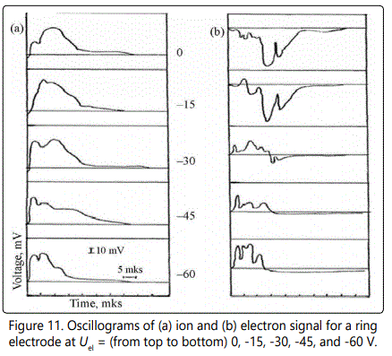 Consider the oscillograms of the ion and electron current, obtained from the collector (Figure 11), which was at a distance of 140 mm from the point of the plasma torch formation. The distance from the point of the plasma formation to the electrodes was 85mm and the distance from the electrode to the collector was 55 mm. The radiation flux density on the sample was equal to 2×109W/cm2. As the voltage at the electrode was increased, the collector measured a decrease in the number of ions in the region of low energies, in agreement with the data on changes in the energy distributions obtained by the mass-spectrometric technique. When applying a positive potential of +100 V to the second grid, an electron signal was observed at the collector at U=0. With increasing potential on the electrode, the electrons gradually disappear from the plasma and the ions, which overcome the energy barrier of 100 V, are registered. The electron signal (Figure 11b) in this case is identical to the ion signals observed (Figure 11a) at a potential of −100 V on the second grid of the collector.