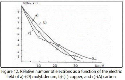 Figure 12 shows the changes in the quantitative characteristics of the electrons in the plasma for different target materials, obtained by the collector. The electrode (2) is located at a distance of 85mm from the target, and the radiation flux density on the target is 2×109W/cm2. One can see from the figure that the dependence of the number of electrons in the plasma on the potential at the electrode does not change with the atomic mass of the ions. When it comes to the mass spectrometric analysis of the laser plasma, at large distances from the point of the plasma torch formation and the electrode it can be noted that the deformation of the energy distribution functions of molybdenum ions is more significant compared to the deformations of the distribution functions of copper ions (comparison is conducted for the case when the electrode is behind the surface of the sample).