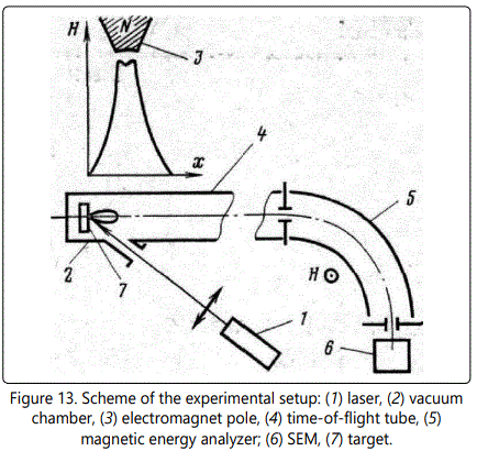 The setup used in the experiments (Figure 13) consisted of a laser with a focusing system; a vacuum chamber; an electromagnet producing a magnetic field, which is transverse to the direction of the laser plasma expansion; and a time-offlight mass spectrometer with a magnetic energy and mass analyzer and detection of ions by the secondary electron multiplier (SEM). The Nd:glass laser produced a power density in the range from 2×109–2×1011W/cm2. The vacuum chamber with a target inside (as a target material use was made of tungsten and molybdenum) was placed between the poles of the electromagnet and made of a copper waveguide segment (cross section of 3×1cm2), which guaranteed the penetration of the magnetic field in the vacuum volume. Besides, the target could be moved along the axis of the chamber, thereby making it possible to study the effect of the magnetic field to form a laser plasma inside or outside the region occupied by the magnetic field with the value in the range from 0 to 10kE. The transverse (to the direction of the plasma expansion and to the magnetic field lines), size of the region occupied by the field e3xceeded the size of the chamber; in this case, the change in the field could in this direction be virtually neglected. The longitudinal size was about 3cm, i.e., it was approximately equal to that of the chamber, and, consequently, to the transverse size of the zone of the magnetic field – plasma interaction.