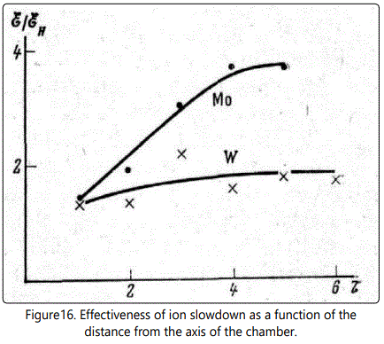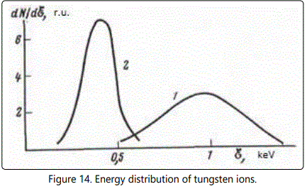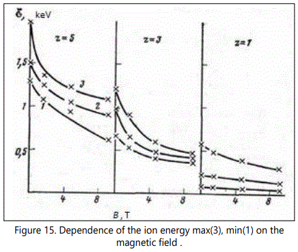 With the laser plasma flying through the region occupied by a transverse magnetic field, the ion energy decreases. Thus, if the freely expanding laser plasma contains tungsten ions with a charge from 1 to 6 (1010W/cm2), the energies of which reach 2.2keV, then at a field of 10kE, the charge and the number of ions remain the same within the limits of experimental error, and the ion energies decreased by about half to 1.2keV (Figure 3.14); lighter ions (molybdenum) are slowed down more effectively. Thus, the ratio of the average energy in the palsmoid at 0 and 10kE reached 2.3. The most significant effect is exerted by the magnetic field on the expansion of ions with a maximum charge.