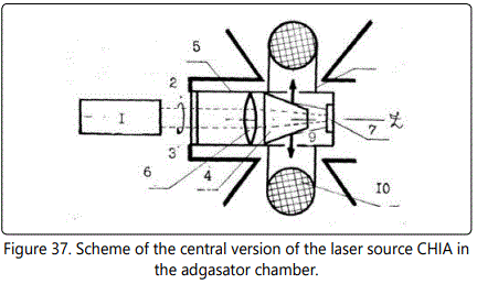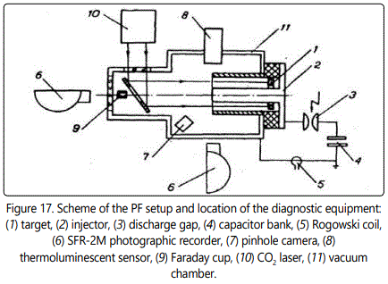 Further experiments on the use of the PF to heat the plasma were carried out on a modernized setup, which makes use of an injector made of cylindrical electrodes with diameters of 15 and 50 mm, length of 150 mm (the electrodes have inserts made of copper, graphite, polyethylene, acrylic glass, porcelain and other materials). As a radiation generator use is made of a pulsed CO2 laser with a double transverse discharge. When employing an unstable resonator, an annular laser beam was directed to the target through the optical elements such as axicon, or through lenses located along a circle. The number of ions formed in the injector varied from 1014 to 1017. In the experiments use was also made of additional diagnostic facilities (Figure 17): Rogowski loop, high-speed photo camera SFR-214, X-ray pinhole cameras, thermoluminescent detectors, grid probes and time-of-flight mass spectrometer. 109