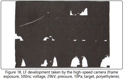 The research conducted allowed one to carry out operation modes, leading to the formation of pinch structures. Figure 18 shows a typical high-speed camera photograph. Measurements performed by using X-pinhole cameras, led to the observation of X-ray sources with the characteristic region of 100µm in size and energy of 1keV. Using thermoluminescent sensors the energy spectrum of the radiation was recovered, which in the range 1–20keV was close to the spectrum of the plasma bremsstrahlung. Probe measurements showed that the laser plasma focus is the source of ions with very high energies.