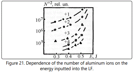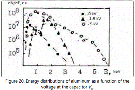 Changes in the energy distribution of multiply charged ions with increasing voltage across the discharge gap from U0=0 and U=5keV (aluminum anode, discharge gap d=5mm, C=0.01µF, angle 0° with respect to the device axis) testify about the increasing compression efficiency of the laser plasma by the magnetic field of the increasing discharge current. Figure 21 shows that this is accompanied by a sharp (almost 2 orders of magnitude) increase in the number of ions of the corresponding charge and in Z to 6 with increasing initial electric field up to E=1kV/cm.