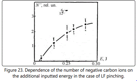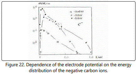 Apart from highly charged positive ions, LF expansion is accompanied by the formation of negative ions. The results of the mass spectrometry analysis of negative ions (anode material is graphite) are presented in Figure 22. The energy distribution of the negative carbon ions in the laser plasma (without the effect of the electric field) has a maximum at 15eV ion energy (2×109W/cm2) and energy spread of 0.5keV. With increasing electric potential on the electrode system to V=5.6kV the maximum of the energy distribution shifts out in the energy range 50– 100eV when the distribution amplitude grows by about 2 orders of magnitude. The number of negative carbon ions increased by 10 times with increasing energy input in the discharge up to 0.3J (Figure 23). Increasing the yield of negative ions can be attributed to the fact that there was an increase in the number of positively charged ions (Figure 21), and, therefore, an increase in the number of recombination neutral atoms. This recombination leads to an increase in negative ions.