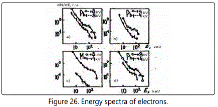 Figure 26 shows the energy spectra obtained for inserts made of molybdenum and lead; these spectra make it possible to trace the effect of the changing polarity on the energy characteristics of electrons. The traditional choice of polarity, when the central electrode is the anode, is characterized by an increase in the total number of high-energy electrons and the appearance of some features in the spectra at electron energies of 100keV. The presence of this feature is apparently due to the onset of an intense electron beam during micro-pinching of the discharge plasma. Therefore, we can assume that at this polarity compression is more effective. Reduction in the total number of registered electrons in the case of reverse polarity is explained by the spread of the electron beam during its expansion in front of the entrance slit of the analyzer. Also of interest is the dependence of the electron flux on the storage capacitor voltage (Figures 26c, d). The discharge current varies from 50 to 100 kA with changing the voltage; in this case, the compression is readily achieved, as evidenced by the change in the shape of the energy distribution of electrons. One can see that no compression is observed for refractory molybdenum at an initiating laser energy of 0.1 J and a voltage of 4 kV due to the lack of seed laser plasma. When the voltage is further increased up to 8 kV, secondary processes after the breakdown of the discharge gap provide enough carriers for the regime, while the low-melting lead this regime already takes place at a voltage of 4 kV, which corresponds to the discharge current of 50 kA.