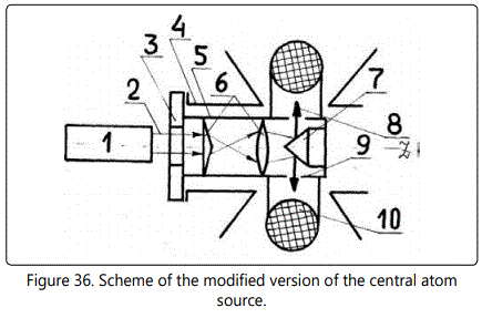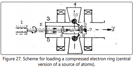 One of the ways to load the ring (central source version) is shown in Figure 27. The laser (1), whose radiation (2) passes through the window (3), enters the adgesator chamber (4) and tube (5) (supporting structure) and is focused by the lens (6) on the target surface (7). The flux of atoms (8) through the holes in the collimating tube (9) propagates into the compressed electronic ring (10). In this arrangement, the flux of atoms should be directed at an angle of 45° to the Z axis. The azimuthal flux uniformity requirements and the possibility to inject atoms into the electronic ring at different moments of its compression (at different radii from 3.5 to 12cm) are achieved by delaying the flux of the atoms relative to the electron beam. The distance from the target to the compressed electron ring of radius 4cm is no more than 6cm, which allows one to load fairly dense fluxes stream of atoms.
