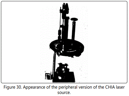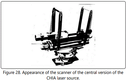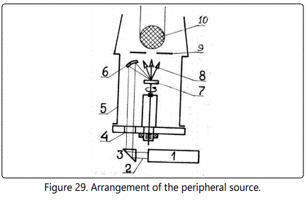 The laser, as the outer part of the source, can be quickly replaced in the case malfunctioning (its life span included 106 operations). The element generally specifying the source parameter is the sample whose surface is subjected to erosion in the interaction with the laser light. The target is placed in the adgesator chamber; quick change of the sample for the central source version is almost impossible, because of the depressurization of the chamber. In such conditions, the maintenance of the stability of the atom flux parameters, i.e., adequate resourcing of the target can be achieved by changing the interaction point. In the laser source of atoms (central version) the interaction point changes by scanning the laser beam over the surface of a stationary target. Laser radiation is scanned by a special device providing a plane-parallel rotational movement of the laser around the Z axis, which is shown in the photo in Figure 28. Thus, the radiation falls onto the focusing lens at the points on the circle. The target lifetime increases with the size of the interaction spot. Changing the position of the interaction point on the sample within a few mm does not lead to a significant change of the atom flux parameters in the region of the compressed electron ring, because the angle between the normal and the axis, which is directed from the interaction point to the ring, as well as the distance between the interaction point of the ring change only slightly.