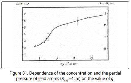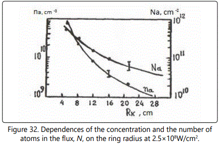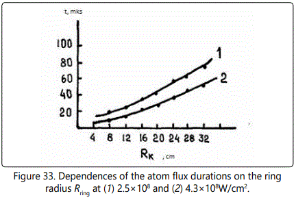 Figure 31 shows the dependences of the average concentrations and partial pressure in the flux of the lead atoms loaded into the ring with a radius of 4cm on the radiation flux density (the measurement error is 20%). Changes in the concentration and flux density of lead atoms for different radii of the ring are shown in Figure 32. Figure 33 presents the dependences of the atom flux duration on the ring radii at different flux densities. It should be noted that the atomic flux parameters satisfy the requirements for loading rings with ions, obtained in the calculations and listed at the beginning of this section.