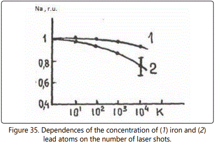 The experimental results showed that the tungsten samples have a very long life span, whereas the shortest life span (among the listed materials) is observed in indium targets. For other materials, we found a strong dependence of the target life span the on the size of the focal spot, which can be explained by a change in the number of atoms and retention of the atom flux duration in general. Figure 35 on the dependences of the concentration of iron and lead atoms (in relative units) on the number of laser shots. A similar dependence was obtained for lead and carbon atoms (108 W/cm2). Under these conditions, the concentration of lead atoms will decrease by 10% when the same point of the target is exposed to no less than 104 laser pulses. Changing the interaction point in the working versions of laser sources can provide a life span of at least 107 laser shots. The atoms are injected into the ring near (a few centimeters) the stainless steel walls of the adgesator accelerator; therefore, a part of the flux of atoms can be reflected from the wall and fall into the ring. In addition, a local region with a high concentration of the working medium atoms can be formed, especially at high repetition rates of the source (50Hz). A relatively small reflection coefficient, a sharp drop in concentration with distance, and the accounting for the angular dependence of the concentration of the reflected atoms lead to the conclusion about their limited impact on the accumulation of ions in the electron ring. Indeed, the concentration of lead atoms in the flux injected into the electron ring of radius 6 cm (the number of electrons is 1013) is equal to (5–10)×109cm-3. Given the above-mentioned factors, the concentration of the atoms reflected back into the ring does not exceed 5×108cm-3, i.e., less than 5% of the concentration of atoms in the main flux. High velocities of the reflected atoms, 7×105cm/s, cause a sufficiently small (of the order of hundreds of microseconds) time during