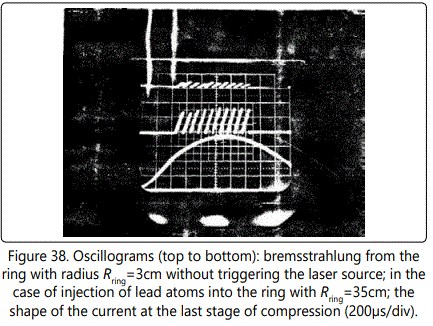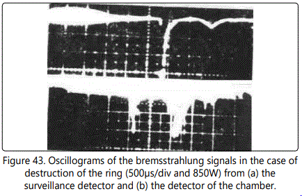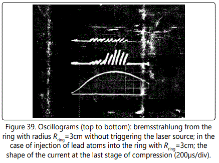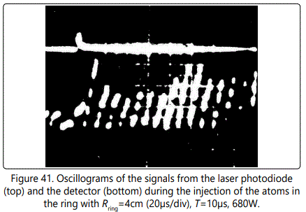 As noted above, by changing the operating mode of the source one can adjust the concentration of the atoms in the flux passing through the electron ring. The range of changes was defined by preset adjustment of the laser source. The laser radiation flux density on the target could be varied by changing the voltage on the capacitors of the discharge pump lamp and with the help of radiation attenuation filters. The entire range of working concentrations of atoms was almost overlapped. At a flux density of 2.5×108W/cm2 (Na=5×1010cm-3) the ring totally or partially collapses (Figure 39). Figure 43a shows the oscillogram from the collector. It can be seen that the flux with a high concentration of atoms is injected into the ring, there appears a large bremsstrahlung signal, preceding the signal of ‘reverse’ injection). At lower densities of atoms the first signal is absent. The signal from the second detector operating in current mode is shown in the oscillogram of Figure 43b. The absence of the bremsstrahlung signal after the first pulse demonstrates the termination of ion accumulation in the ring. At 107W/cm2(Na=5×108cm-3) the bremsstrahlung from the ring with the detector sensitivity taken into account was not observed. Thus, it is possible to optimize the process of the ring loading with the ions when the laser source is properly adjusted. When the atoms are injected into the ring of a large radius (up to 35cm), which is then compressed, one can observe stable bremsstrahlung signals that existed until the destruction of the ring after compression. This experimentally recorded fact indicates the possible usage of the time of the loaded ring compression to increase the average charge of accumulated ions (Figure 38).