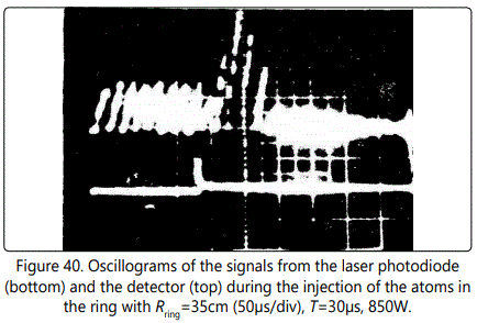 The experiments conducted allowed us to estimate the duration of the atom flux and the rate of its propagation by the bremsstrahlung of the electrons in the ring. Figure 3.40 shows the oscillogram of the bremsstrahlung during the injection of the atoms into the ring with Rring=35cm (in a constant magnetic field, without the ring compression). In this case, the depth of the potential well in the ring is not sufficient for trapping the ions, i.e., the duration of the electron bremsstrahlung corresponds to the time of their interaction with the injected atoms. It can be seen that the duration of the flux of atoms (80µs) is consistent with the data of Figure 33. At a distance of 35 cm a package of atoms ‘spreads’ due to the initial spread in their velocity. Figure 41 presents the oscillogram of the bremsstrahlung from the ring with a radius of about 3.5cm, which is injected into a flux of atoms. After an atom flux of duration 1015µs passes through the ring, which is in agreement with Figure 33, one can observe the signals of the electron bremsstrahlung on the accumulated ions. Using the delay (in Figures 40 and 41) between the laser photodiode signal and the bremsstrahlung signal, and taking into account the known target – ring distance, the velocity of lead atoms has been experimentally determined. The obtained values of the velocity well agree with those obtained by the methods described in previous chapters. Experiments on the loading of the rings with lead ions were held at an estimated number of electrons in the ring (5–7)×1012. The cross section of the atom flux by the median plane is a few centimeters in size (due to the relatively large size of the collimating holes in the tube), but the atom flux duration (a few tens of microseconds) is much less than the time of the ring compression (about 2.5µs). Therefore, taking into account the time of the flux propagation, it was possible to inject the atoms into the electron rings of a certain radius. Figure 42 shows the current oscillogram in the coil of the third compression stage and the oscillogram of the bremsstrahlung from the ring after the laser source triggering. The source was triggered 600µs before the current reached the maximum. The photomultiplier operated in the gamma photon counting mode in the gate of pulses. It can be seen that after the atom flux passes through the ring, the intensity of gamma radiation remains the same. Thus, lead ions were accumulated in the electron ring. The ratio of gamma photons in the case of a laser source to gamma photons in the case of another source of ions indicates the magnitude of the accumulated ions.