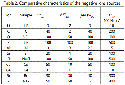 Table 2. presents comparative characteristics of the existing sources of negative ions of heavy elements with integral data output. Apart from the advantages of conventional sources, it is necessary to mention some drawbacks, namely:
