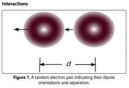 There are two types of interactions of tandem electrons oriented as shown in Figure 1. The first is the magnetic dipoledipole interaction, well-studied when the dipoles are of macroscopic scale. The second is the electrostatic charge interaction of the two electrons. The magnetic dipole-dipole interaction is attractive just as in the macroscopic case of two bar magnets. The electrostatic interaction, on the other hand, is repulsive, thus presenting the possibility of a balance of forces.