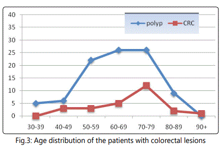 CRC occurred most commonly in the age group between 70 and 89 years but colon polyps did in the age groups between 60 and 79 years. Most patients were between 60 and 90 years old (Fig. 3). There was no statistically significant difference between the patients' groups of 30-50 years and above 80 years concerning the presence of colon polyp and CRC. The number of colon polyp patients was reliably greater than that of CRC ones (p<0.05) (Fig. 3).