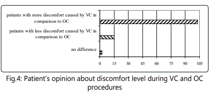 The analysis of the questionnaire about patient's attitude to both methods showed that 85.83% of patients reported less discomfort while 12, 5% reported more discomfort caused by VC as compared to OC (Fig. 4). This difference was statistically significant (t=7.97, p<0.001).