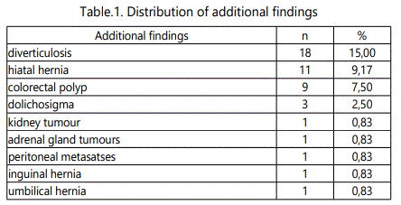 In 115 patients (in 95,83% of the cases), VC was positive for colorectal lesions. A colon polyp was diagnosed in 94 patients (in 78,33%) but a CRC - in 26 patients (in 21,67% of the cases).