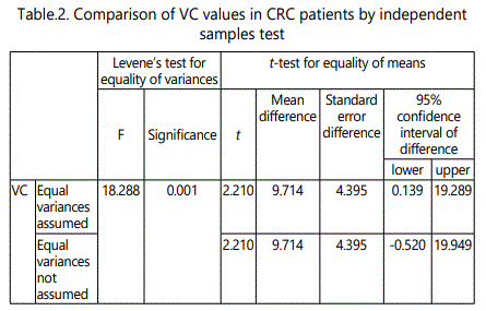 The statistically significant comparisons of VC values in CRC patients were demonstrated on Table 2.