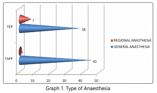 Results: The mean age of study subjects was 49.46+/-7.38 years. The mean operative time required for TAPP 88 minutes and TEP was 70 minutes. 66.7% of the TAPP patients had a pain score of 1 to 2 and 80% of the TEP patients had pain score of 1 to 2 according to visual analogue scale. The hospital stay in TAPP was 2.27 days and 2.53 days in TEP. Recovery period in TAPP was 6.43 days and 7.20 days for TEP.