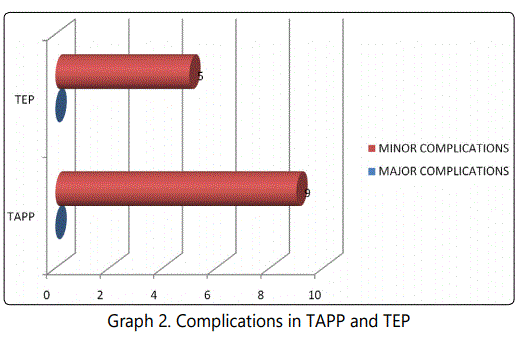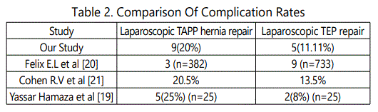 There was no major complications in any of the study subjects, although 9(20%) subjects had minor complications in TAPP (p=0.034) and 5(11.11%) subjects in TEP group. In a study done by Felix E.L et al [20], 3 subjects showed complications in laparoscopic TAPP (n=382) as compared to 9 subjects in TEP group (n=733). Cohen R.V et al [21]., showed 20.5% complications in laparoscopic TAPP as compared to 13.5% in TEP group. Yassar Hamaza et al [19], study showed 5(25%) subjects in laparoscopic TAPP (n=25) and 2(8%) in TEP group (n=25) (Table 2).