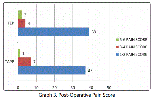 Post-operative pain in laparoscopic TEP showed pain score of; 1-2 score (mild pain) in 39(86.67%) subjects, 3-4 score (discomfort) in 4(8.89%) subjects and 5-6 score (distressing) in 2(4.44%) subjects. TAPP group showed a pain score which included, 37(82.22%) subjects 1-2 score, 7(15.56%) subjects, 3-4 score and 1(2.22%) subject had 5-6 score. Post-op pain is statistically similar between two groups of study subjects (p=0.62) which was statistically insignificant.
