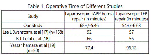 The mean operative time was 68+/-5.46 minutes for laparoscopic TAPP hernia repair and 54+/-6.63 minutes for laparoscopic TEP hernia repair. The overall mean operative time was significantly less in laparoscopic TEP repair than in laparoscopic TAPP repair (t=3.462 and p=0.001). In a study done by Lee L Swanstorm, et al [17], the mean operative time was 92 minutes in laparoscopic TAPP group as compared to 57 minutes in TEP group (n=158). B.J. Leibl et al [18], showed the mean operative time of 66 minutes in laparoscopic TAPP group and 56 minutes in TEP group. The study of Yassar hamaza et al [19]., showed a mean operative time of 77.4 in laparoscopic TAPP (n=25) and 96.12 in TEP group (n=25) (Table 1).