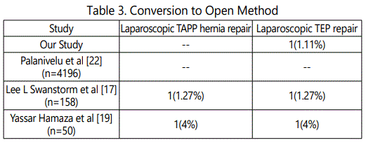 1(1.11%) subject in TEP group was converted to open method in our study as compared to the study done by Palanivelu et al [22], where no cases in both laparoscopic TAPP and TEP was converted to open method (n=4196). Study done by Lee L Swanstorm et al [17]., and Yassar Hamaza et al [19], showed 1 case each was converted to open method in both laparoscopic TAPP and TEP groups respectively. Peritoneal defects are known to occur in 10 % to 47 % of extra peritoneal repairs, making it imperative to master TAPP repair in order to avoid conversion to open method [23] (Table 3).