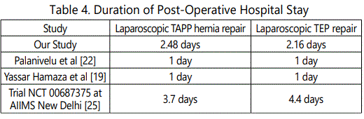 The mean length of post operative hospital stay in laparoscopic TAPP was 2.48 days and TEP group was 2.16 days (p=0.27). TEP approaches for open recurrent and bilateral hernia is associated with a low complication rate and less hospital stay [24], the results fall in line with the NICE (National Institute of Clinical Excellence) guidelines. In a study done by Palanivelu et al [22], and Yassar Hamaza et al [19], mean length of post operative hospital stay was 1 day each in both laparoscopic TAPP and TEP groups respectively. Trial NCT 00687375 at AIIMS New Delhi [25], showed a mean length of post operative hospital stay of 3.7 days in laparoscopic TAPP and 4.4 days in TEP group (Table 4).