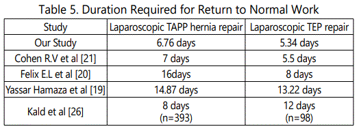 Laparoscopic TEP group were able to resume their normal work within 5.34 days when compared to Laparoscopic TAPP group who took 6.76 days to resume their normal work (p=0.363). In a study done by Cohen R.V et al [21]., study subjects resumed their normal works in 7 days and 5.5 days in laparoscopic TAPP and TEP groups respectively. Study done by Felix E.L et al [20], showed 16 days and 8 days to resume their normal work in laparoscopic TAPP and TEP groups respectively. Yassar Hamaza et al [19], showed 14.87 days in laparoscopic TAPP and 13.22 days in TEP group to resume their normal work. A multicenter randomized prospective trial done by Kald et al [26], showed 8 days and 12 days in laparoscopic TAPP and TEP groups respectively to resume their normal work (Table 5).