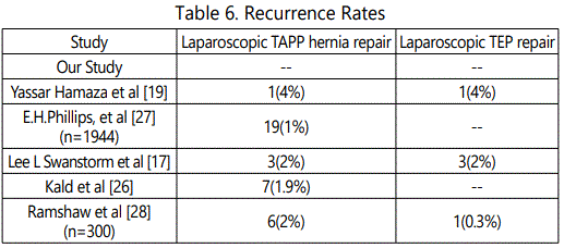 There was no recurrence noted in any of the study subjects in both the groups in our study as compared to the study done by Yassar Hamaza et al [19], recurrence in 1(4%) subject each in both laparoscopic TAPP and TEP groups (n=50). E.H.Phillips, et al [27], 19(1%) subjects showed recurrence in laparoscopic TAPP group and no recurrence in TEP group (n=1944). Lee L Swanstorm et al [17], 3(2%) subjects each showed recurrence in both laparoscopic TAPP and TEP groups respectively. Multicenter prospective randomized controlled studies done by Kald et al [26], showed 7(1.9%) recurrence in laparoscopic TAPP (n=393) and no recurrence in TEP group (n=98) and Ramshaw et al [28]., showed 6(2%) recurrence in laparoscopic TAPP and 1(0.3%) in TEP groups (n=300) (Table 6).