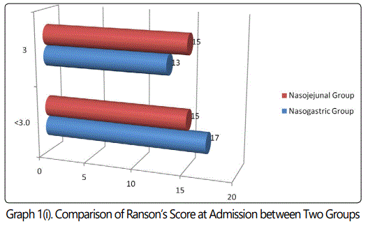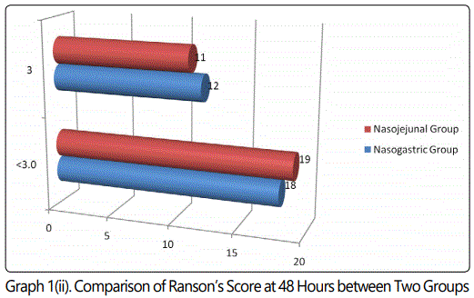 During the 24 months study period, 30 patients of acute pancreatitis were fed by nasogastric route and 30 patients had nasojejunal feeding. The mean age group of the study subjects was 36.34 (range 22-64) years in nasogastric group and 38.73 (range 24-68) years in nasojejunal group. The gender distribution showed 30(100%) males in nasogastric group; 28(93.33%) males and 2(6.67%) females in nasojejunal group. The etiology of pancreatitis include 21(70%) alchohol, 6(20%) biliary and 3(10%) others in nasogastric and 25(83.33%) alchohol, 4(13.33%) biliary and 1(3.33%) others in nasojejunal group. The Ranson score at presentation and at 48 hours after admission, APACHE score, CTSI and presence or absence of organ failure were used to assess the severity of acute pancreatitis. The severity was similar in both the nasogastric and nasojejunal groups (Table 1-2, Graph 1(i,ii)-4). The baseline Body mass index (BMI), Mid arm circumference (MAC) and triceps skin fold thickness(SFT) were similar in both nasogastric and nasojejunal groups. The total protein (TP) and serum albumin (Alb) as measured by biochemical tests were also similar in both groups.