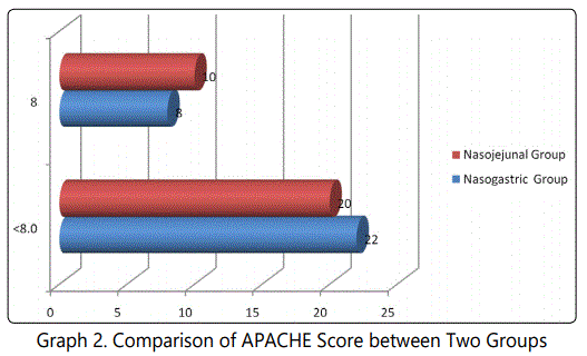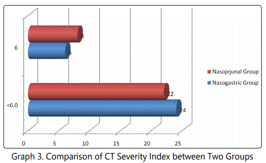 9(30%) patients in the nasogastric group and 3(10%) patients in nasojejunal group required to stay in the ICU. 2(6.67%) patients in nasogastric group and 1(3.33%) in the nasojejunal group required surgical intervention in the form of necrosectomy. Total Mortality was 2(6.67%) patients in nasogastric group and no patients died in nasojejunal group (Table 4, Graph 5).
