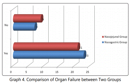 Previous studies reported overall length of stay in nasogastrically fed patients ranging from 7 to 82 days (Mean 9-24days). This was comparable to the patients receiving nasojejunal feeds. In the present study the mean length of stay was 14.8days in the nasogastric group. However most studies reported a higher percentage of patients requiring ventilator support. Multiple organ failure in the present study was 9(15%) subjects which was similar to that of Kumar, et al of 18.8% [19].