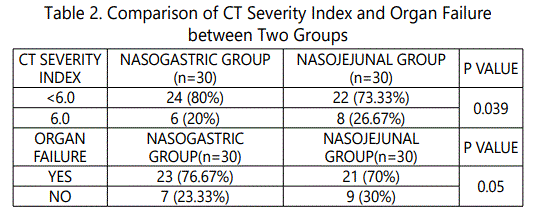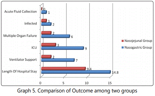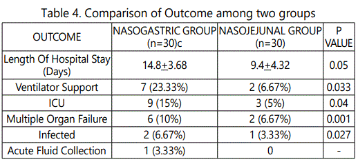 On comparison of outcomes between the nasogastric and nasojejunal groups; nasojejunal feeding group had lesser length of hospital stay, need for ventilator support, and less chances of multiple organ failure or infected necrosis as compared to nasogastric group (p 0.05). The ICU stay and formation of acute fluid collections were more in nasogastric group.